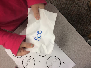 They write the word from the snowball on the recording sheet. Then they crumple it back up to make a "snow"ball and put it back in the bucket.